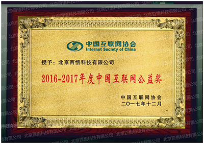 2018年1月9日,由中國(guó)互聯(lián)網(wǎng)協(xié)會(huì)舉辦的“2018中國(guó)互聯(lián)網(wǎng)產(chǎn)業(yè)年會(huì)”在北京國(guó)家會(huì)議中心舉辦。在大會(huì)上,百悟科技憑借著在社會(huì)公益領(lǐng)域突出的貢獻(xiàn)和影響力,獲得了“2016—2017年度中國(guó)互聯(lián)網(wǎng)公益”獎(jiǎng)。