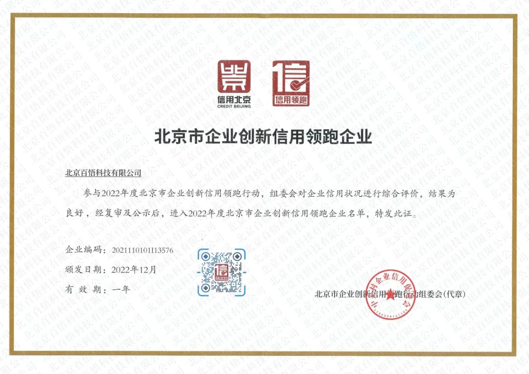 近日,2022年度北京市企業(yè)創(chuàng)新信用領(lǐng)跑行動(dòng)入圍企業(yè)名單公示,北京百悟科技有限公司(以下簡(jiǎn)稱“百悟科技”)憑借良好的信用記錄以及強(qiáng)大的產(chǎn)研創(chuàng)新實(shí)力,成功進(jìn)入信用“白名單”,獲評(píng)2022年度信用領(lǐng)跑企業(yè)。